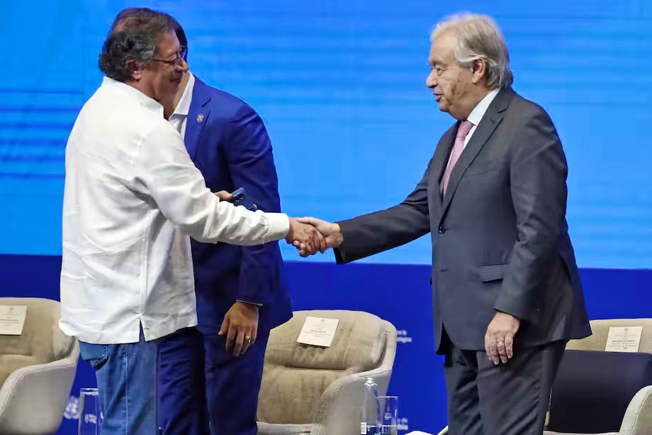 El secretario general de la ONU, António Guterres, destacó las iniciativas de paz del presidente Gustavo Petro y el plan de choque del Acuerdo de Paz. El secretario mencionó que la Paz Total es un objetivo loable que puede ser complementario a los Acuerdos de Paz firmados en 2016, pues estos siguen siendo la hoja de ruta principal para transformar el conflicto violento en el país. Ante ello, resaltó el plan de choque que el Gobierno Nacional formuló en septiembre para impulsar la implementación de dichos Acuerdos, el cual pretende agilizar el acceso de tierras, actualizar el Sistema Integral de Seguridad para el Ejercicio de la Política (SISEP) y redefinir algunas funciones del Gabinete de Paz.