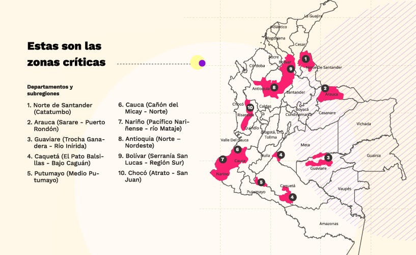 Las 10 regiones críticas agrupan 40 municipios que comparten varias características: son territorios en disputa entre grupos armados, estratégicos para economías ilegales —como la minería ilícita, los cultivos de coca y el tráfico de drogas— y con una presencia institucional frágil. Estas dinámicas de violencia generan, además, altos impactos humanitarios.