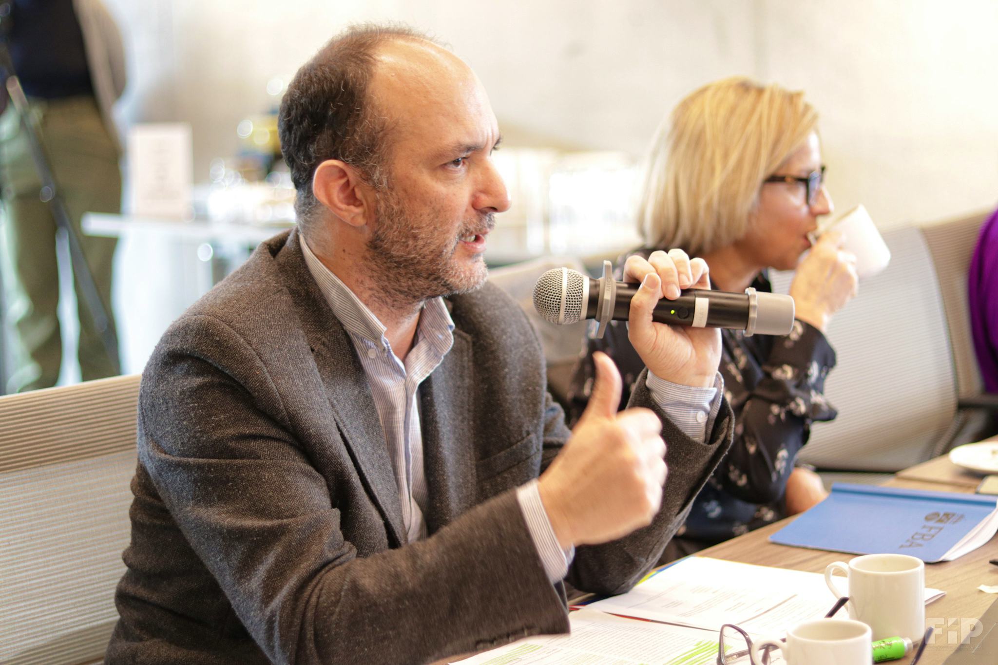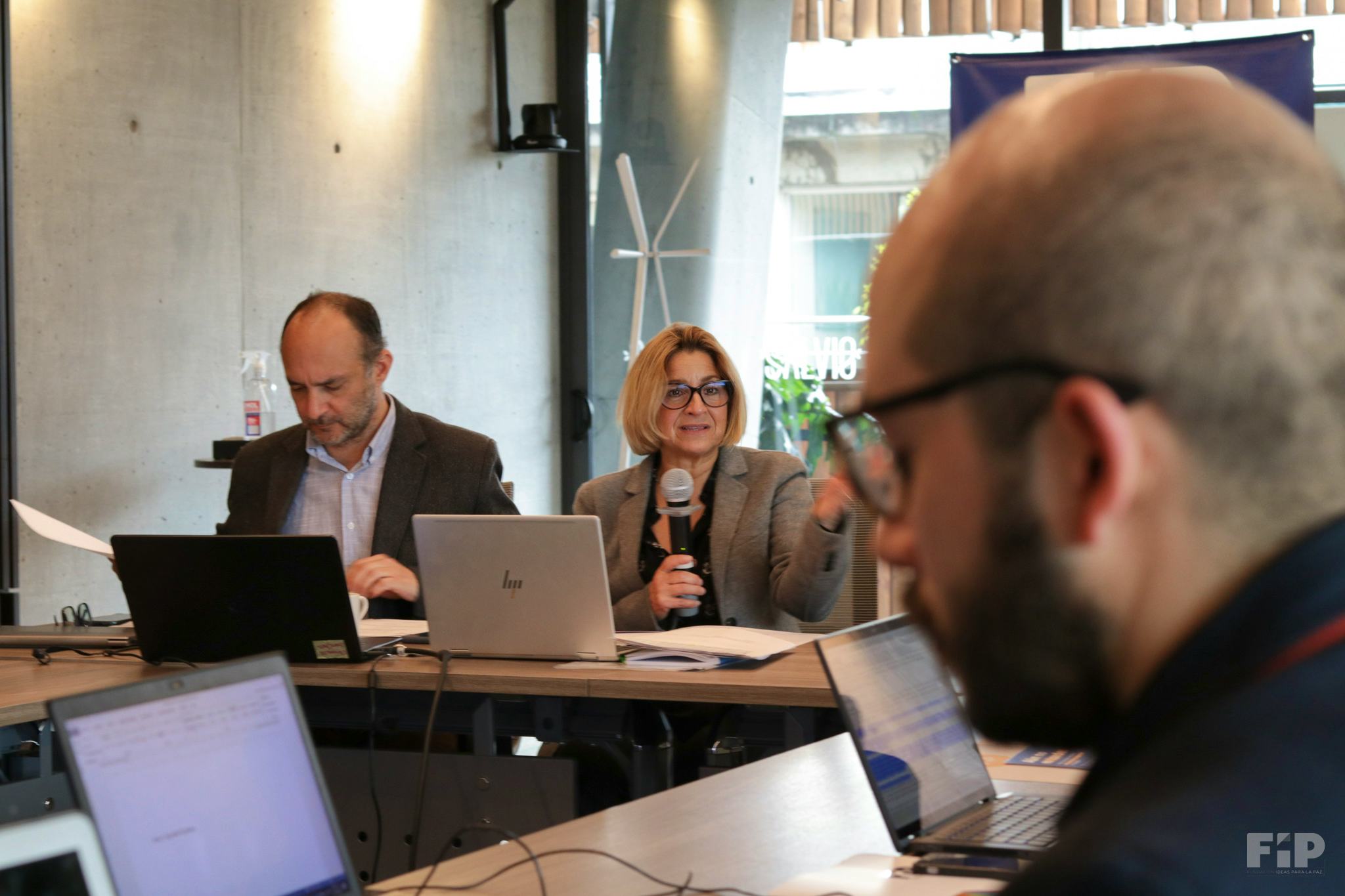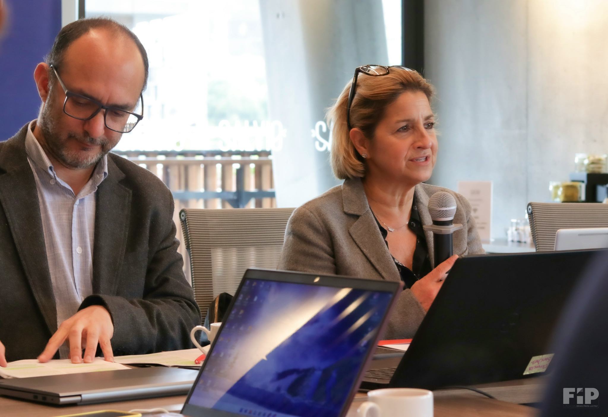 1 / 14 · Jerónimo Castillo y María Victoria Llorente de la FIP orientaron el diálogo con el MinDefensa © FIP -